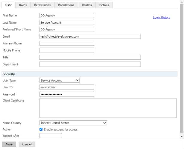 - Add user details & credentials with “User Type” set to “Service account”. Establish a username and password, of which, both need to be void of any special characters. The only characters used should be upper- or lower-case letters and numbers.